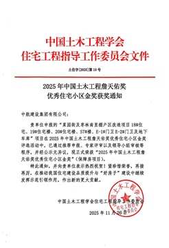詹天佑奖优秀住宅小区金奖——是经国家科技部批准、住建部认定的中国土木工程领域最高奖项之一,此番斩获这一行业重量级荣誉,是集团公司坚守匠心筑造,践行高质量发展理念的有力彰显,更是我们在城市更新领域综合实力与民生责任担当的权威印证。